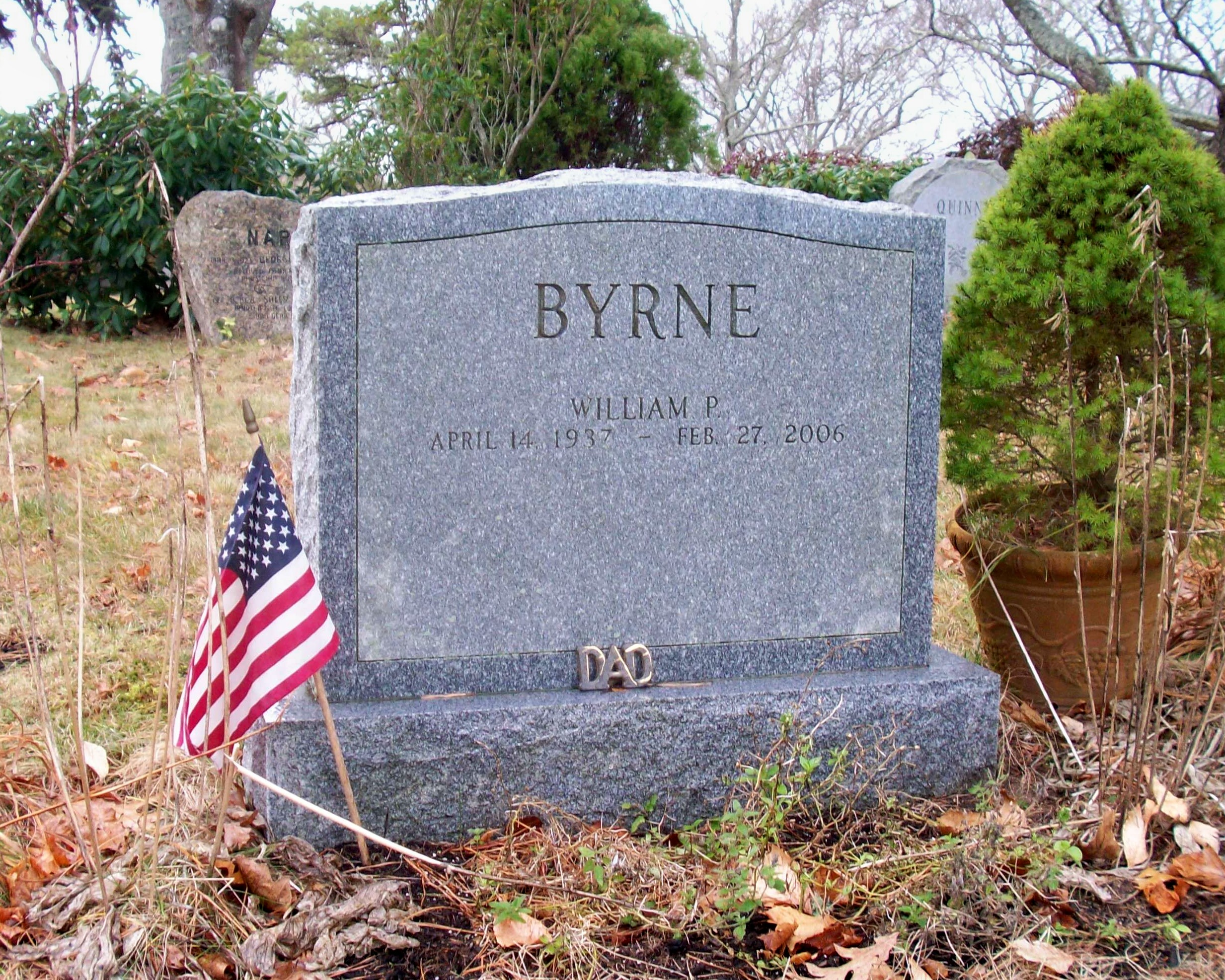 William P Byrne 1937 – 2006 William P Byrne Headstone Ancestry: Unknown Born: April 14, 1937 Father: Unknown Mother: Unknown Died: February 27, 2006 Buried: Cataumet Cemetery; area D Married: Unknown